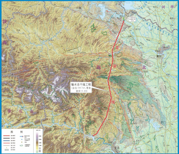 輸水總干線全長約194.7公里,為單洞布置,由進口建筑物、輸水隧洞、石花控制建筑物、出口建筑物、檢修交通洞、檢修排水泵站等組成,其中輸水隧洞長約194.19公里,等效洞徑10.2米。25條施工支洞(含豎井)全長44.9公里,最長支洞3.87公里。