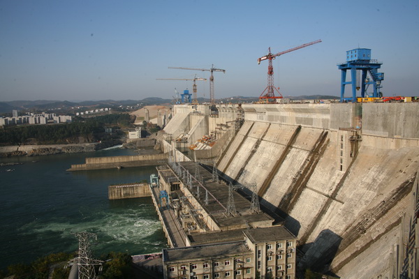 丹江口大壩加高工程位于湖北省丹江口市境內(nèi)漢江干流與其支流丹江匯合口下游800米處,是在原有壩體上進(jìn)行混凝土培厚加高,包括混凝土大壩加高和心墻土石壩加高。大壩加高工程完建后,壩頂高程由目前的162米增加到176.6米,壩頂軸線長3442米,正常蓄水位由157米抬高至170米,可相應(yīng)增加庫容116億立方米?;炷链髩渭痈咧?,由于新老混凝土彈性模量的差異,在內(nèi)外部溫差的作用下,對新老混凝土結(jié)合面和壩體應(yīng)力產(chǎn)生不利影響。在進(jìn)行大量計算分析研究的基礎(chǔ)上,結(jié)合大量試驗室和施工現(xiàn)場原位試驗,提出了滿足設(shè)計要求的新老混凝土結(jié)合的具體結(jié)構(gòu)措施。在不影響大壩正常運行情況下,完成混凝土大壩裂縫檢查、修補(bǔ)和大壩加高,其建設(shè)難度在大壩加高史上可謂世界之最。
