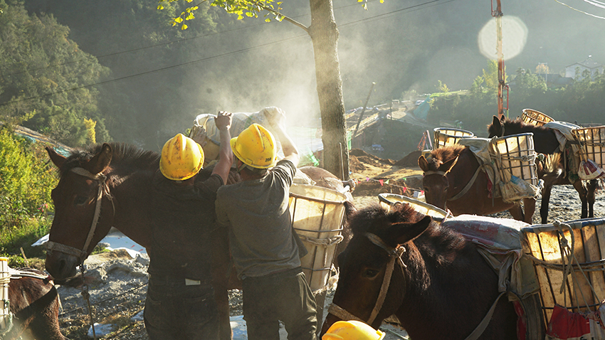 開(kāi)工初期,征盡周邊區(qū)縣騾馬,仍然不能滿足用工需求。為搶進(jìn)度,建管二部經(jīng)多方協(xié)調(diào),積極在云貴川等省份跨省調(diào)運(yùn)騾馬,累計(jì)已投入140匹,每匹騾馬1次可馱運(yùn)物料200公斤。